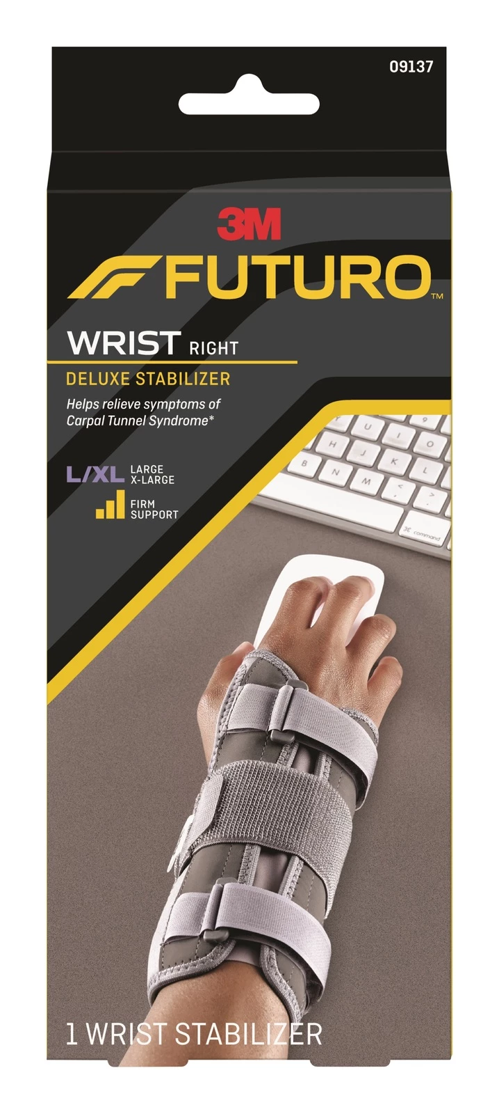 The FUTURO Deluxe Wrist Stabilizer delivers superior, stabilizing support to help relieve symptoms associated with Carpel Tunnel Syndrome. Adjustable features provide customizable support, and memory foam in the palm conforms comfortably to your hand. The ergonomic design delivers full range of motion to your fingers. Wrist injuries can affect your quality of life–so reach for the stabilizing comfort of the FUTURO Deluxe Wrist Stabilizer to help you get back to work and the activities you enjoy most.