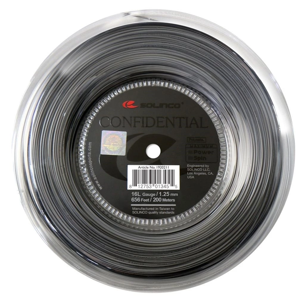Solinco Confidential is a newly developed, high-performance and versatile co-polyester string designed to offer playability and control while generating extreme power and intense spin and bite. Utilizes a newly developed chemical formula in combination with the high-powered polyester monofilament fibre designed and shaped to generate maximum power and control while amplifying the spin and bite intensity of the ball.