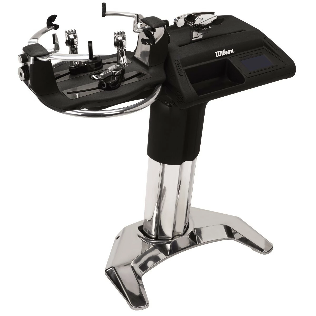 The Baiardo L builds upon the architecture and design of the award-winning Wilson Baiardo machine with a commitment to lightweight efficiency and practicality. Weighing 20% lighter than the original Baiardo, this machine maintains a sleek look with a few new features: manual up-down tilt for ideal ergonomic design, five-teeth clamps to minimize string interference, mounting posts that adjust inward to better fit badminton racquets, and a reel rack on the floor stand that holds string reels for added convenience. Users can toggle between KG and LBS, select from three pulling speeds, adjust pre-stretch up to 20%, and tie off knots with 10% extra tension. Additional settings on the display include calibration, touch button sensitivity, and ability to view number of rackets strung.